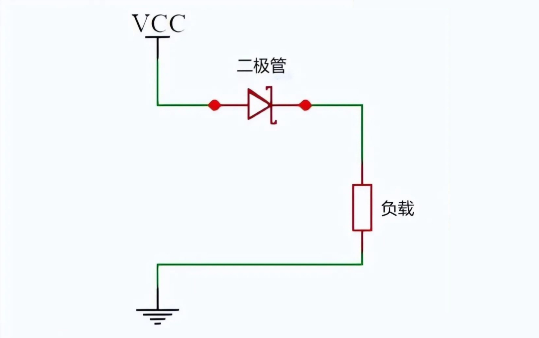 肖特基二极管常用于保护电路,如反极性电路,因为它的正向压降低,下图为常见的反极性电路。当 Vcc 和地以正确的极性连接时,二极管正向传导,负载接收功率。与整流二极管的 0.7V 相比,肖基特二极管上的正向压降在 0.04V 左右非常少,这样二极管上的功率损耗不会太大,而且肖特基二极管可以允许更多的电流通过它,还具有更快的开关速度,因此可以用于高频电路。